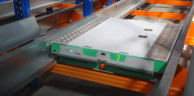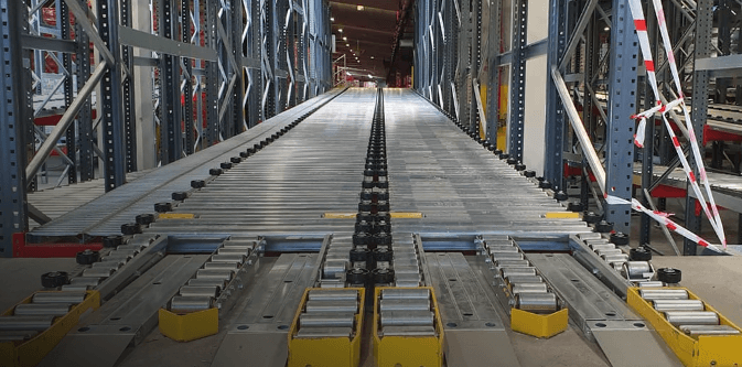Este sistema agrade os sistemas drive-in e push-back, pois permite armazenamento FIFO ou LIFO. Essa estante, também em bloco, portanto não permite a circulação de empilhador no seu interior, é um sistema semi-automático que utiliza um transportador que recebe a palete e a transporta até a última posição disponível.